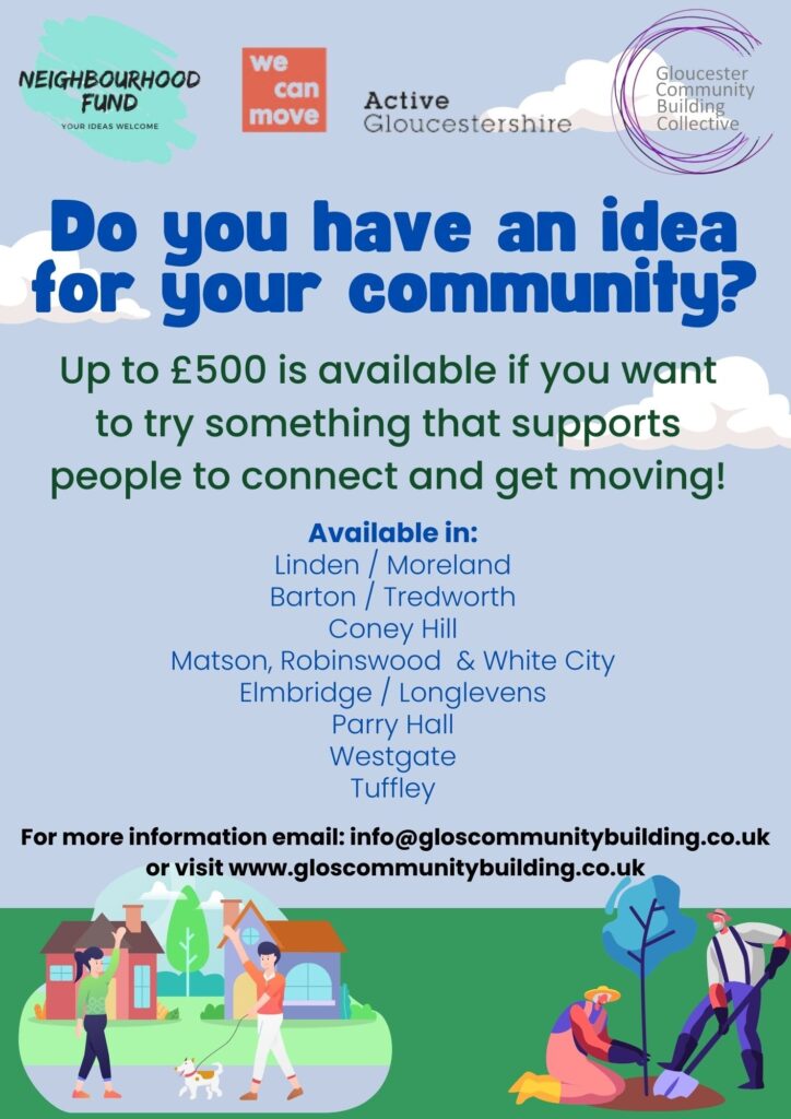 The funding is aimed at creating a positive impact on a group of people or wider community/neighbourhood. Supporting people to connect, enable them to be more physically active and improve peoples wellbeing.